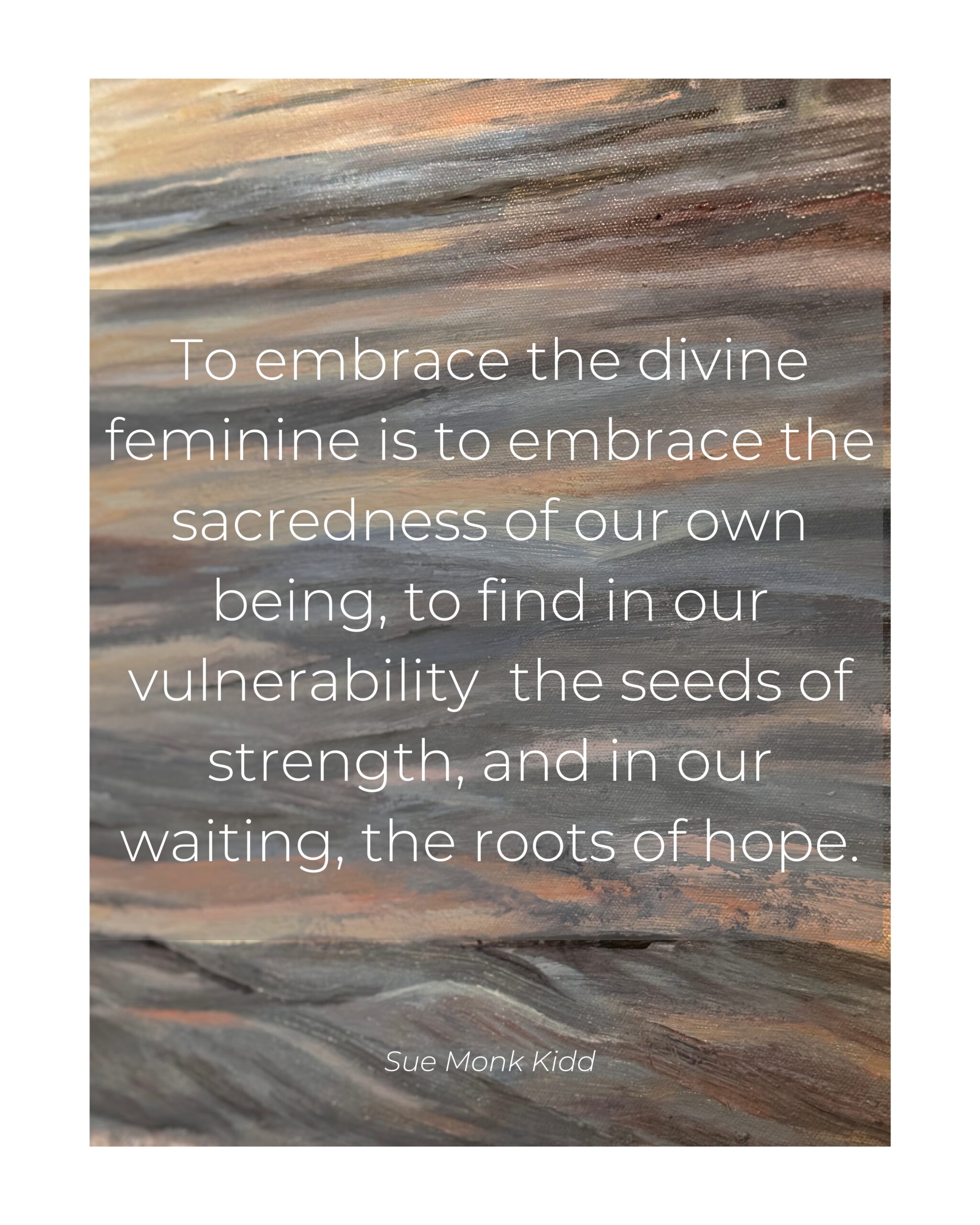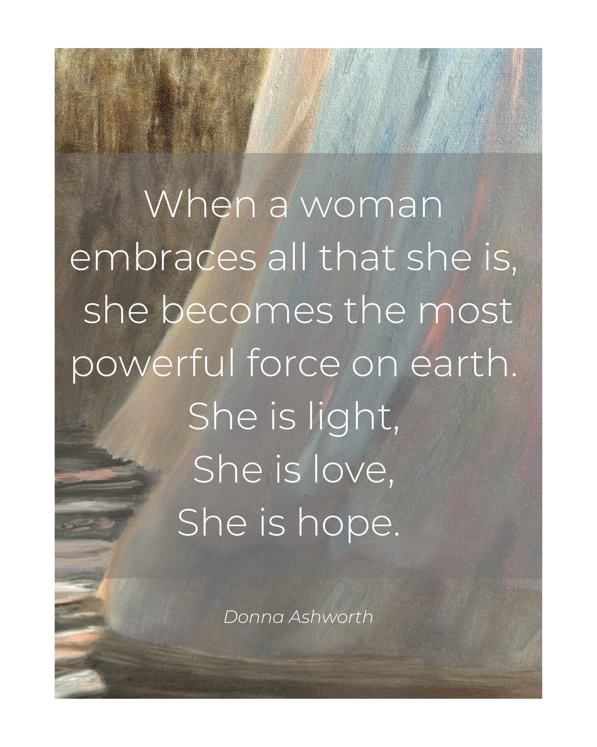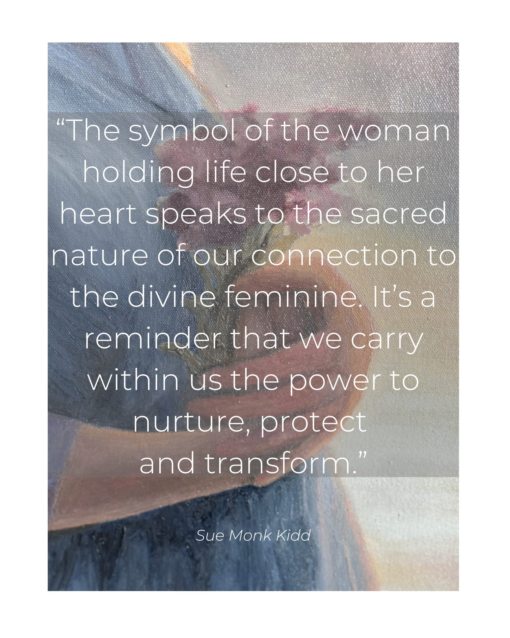 “This painting captures the tender strength and boundless hope embodied by the divine feminine—our Heavenly Mother. She offers us more than guidance; she offers us a deep, nurturing love that sustains us through life’s greatest challenges. The flowing water around her symbolizes the eternal, life-giving force of the divine, urging us to honor our sacred connection to her and to the world she helps create. May this artwork remind you to embrace the hope she offers, trust in the unfolding of your journey, and find profound strength in the beauty of your vulnerability.”