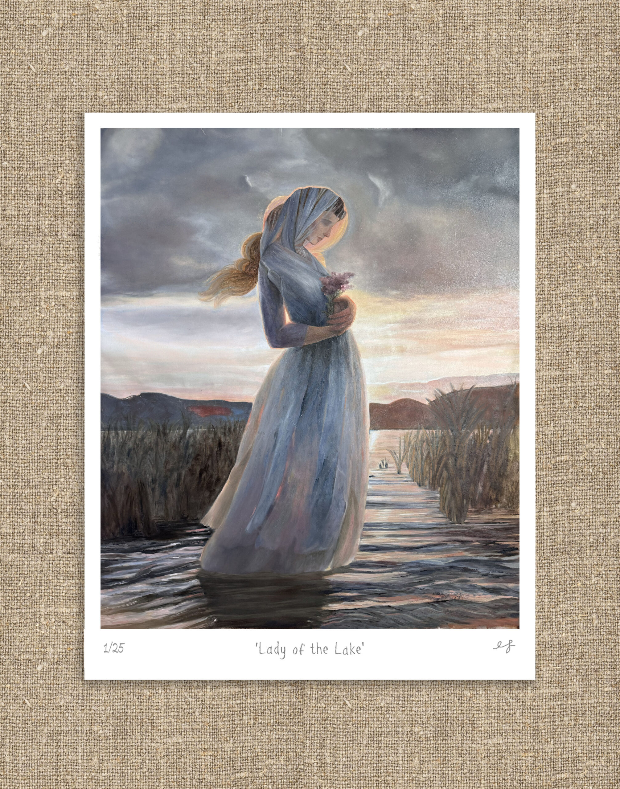 In this limited edition print, The Lady of the Lake stands at dawn where water meets land, embodying strength and vulnerability. Her figure symbolizes hope—a nurturing, life-sustaining force that guides us through life’s uncertainties.
